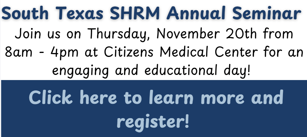 Thank you for visiting the home page of the South Texas Society for Human Resources Management (South Texas SHRM). We are the premier association for human resource management professionals in the South Texas Region encompassing Gonzales, Victoria, Seguin and everything in between. If you have any questions about our organization or would like to receive information, please contact Sarah Austin, South Texas SHRM Membership Director at at 361-572-5081.